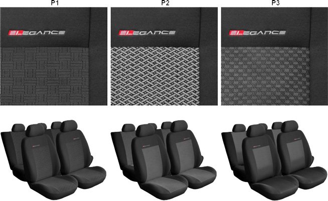 Autopotahy řady Elegance mají boční části vyrobené z odolného, ​​látkového čalounění, střední část je vyrobena z velurové, vzorované tkaniny. Tyto materiály jsou laminované polyuretanovou pěnou a podšívkou. Kromě toho se na nich nachází ještě jemná výšivka, typická pro řadu Elegance. Dostupné jsou ve třech pečlivě vybraných, estetických vzorech.
